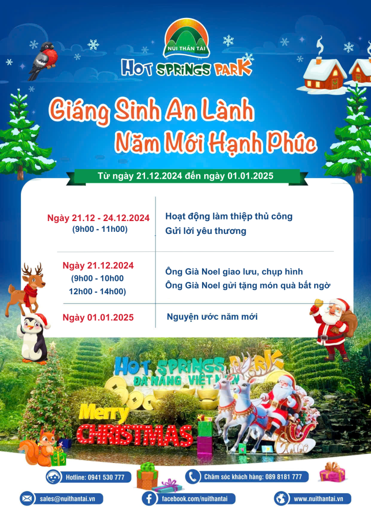Mừng Giáng sinh 2024 và chào đón năm mới 2025, khu du lịch CVSKN Núi Thần Tài sẽ tổ chức chuỗi sự kiện các chương trình hoạt động với chủ đề “GIÁNG SINH AN LÀNH – NĂM MỚI HẠNH PHÚC” với vô vàn các hoạt động hấp dẫn chờ đón du khách từ ngày 21/12/2024- 02/01/2025.